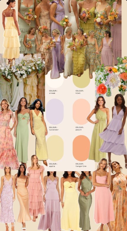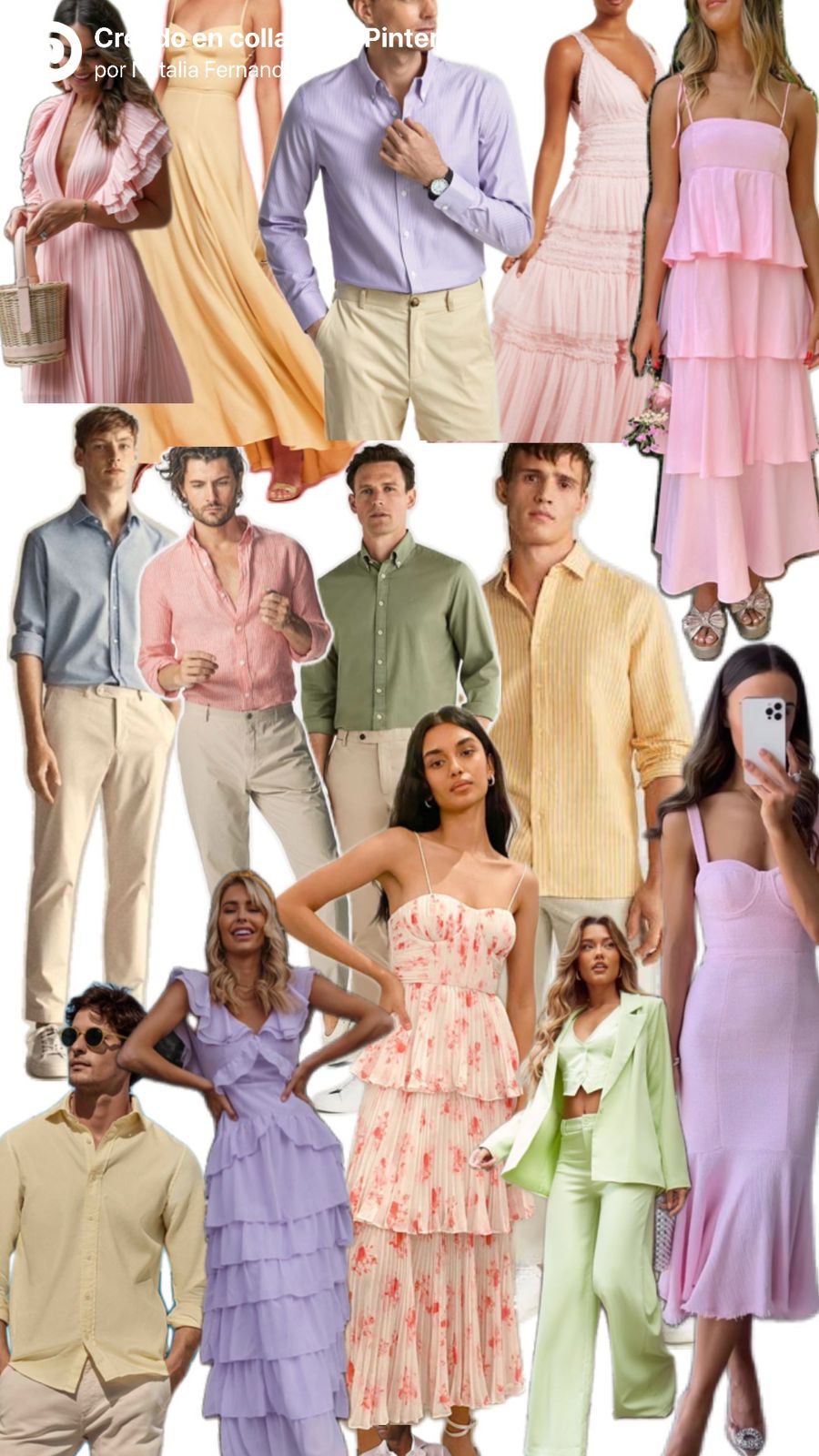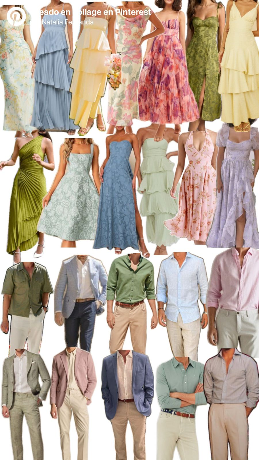 Para las mujeres, puede ser vestido midi/maxi o conjunto formal en tonos coloridos. Puede ser floreado, colores pasteles o colores más vivos.